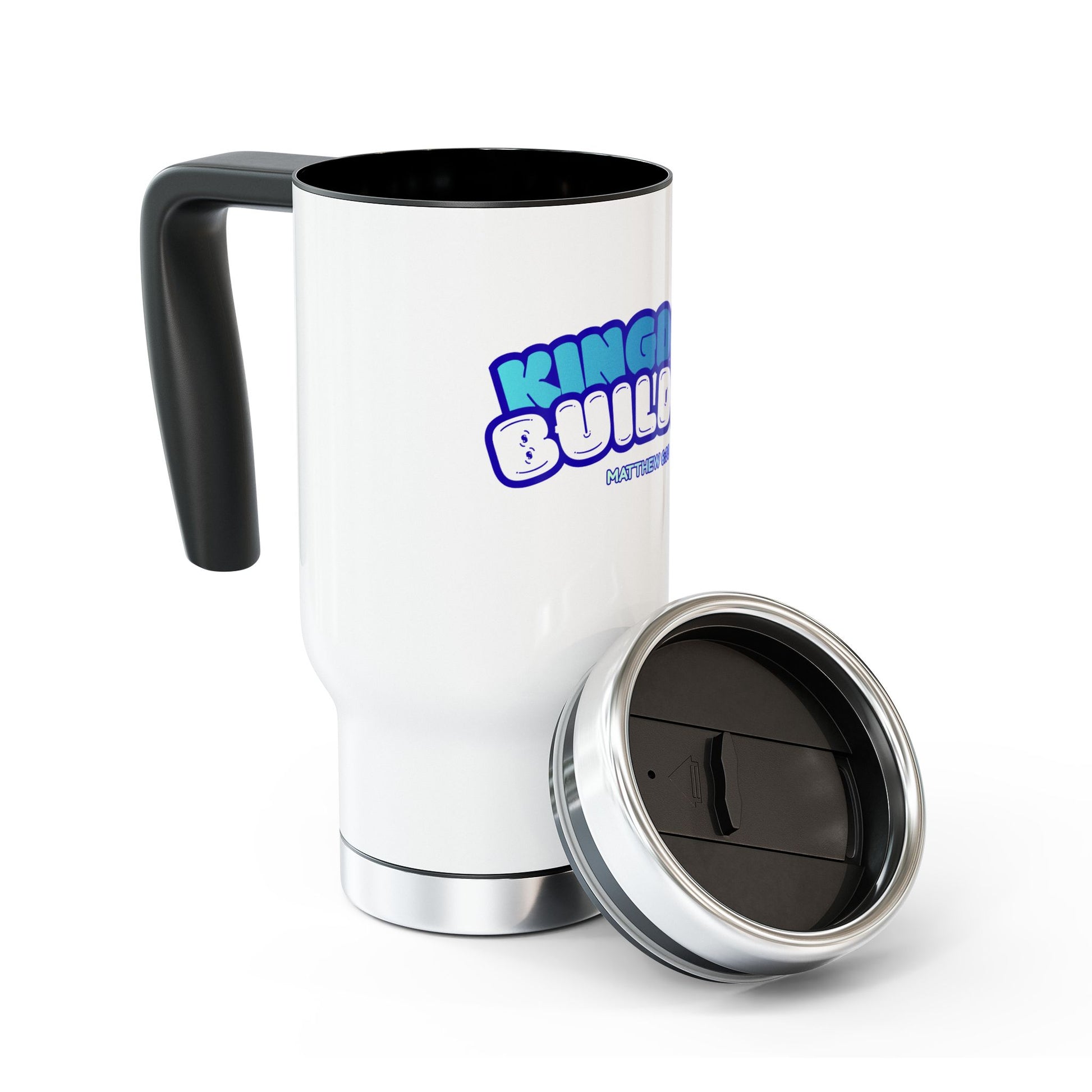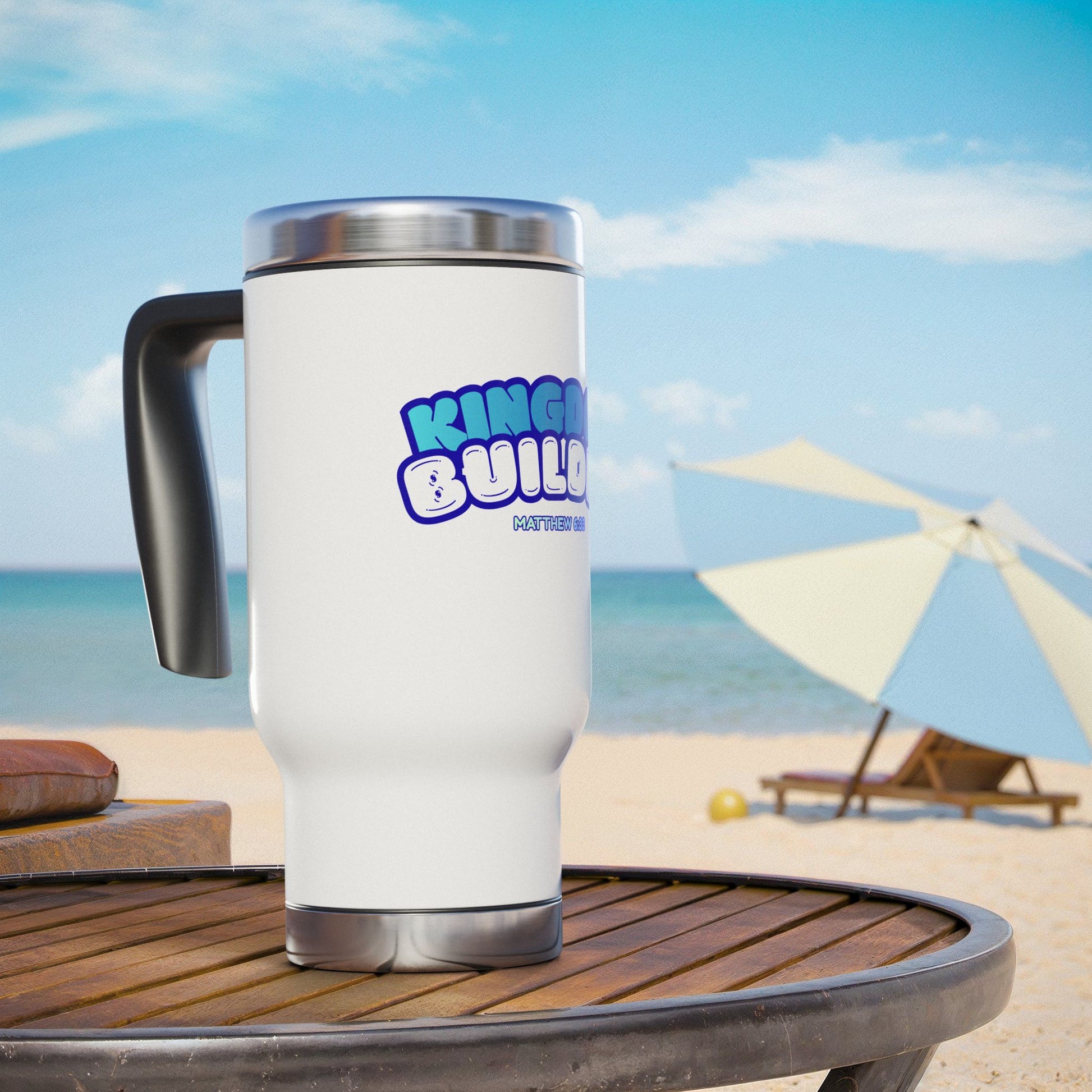 This 14 oz stainless steel travel mug brings bright, feel-good energy to your daily routine. The glossy white enamel body showcases a bold, retro-inspired “Kingdom Builder” graphic inspired by Matthew 6:33. A spill-resistant snap-on cap and screw-on bottom help keep your drink secure while the inner plastic insulation holds temperature a little longer between sips. The molded handle makes it easy to carry on commutes, walks, or desk-side mornings.